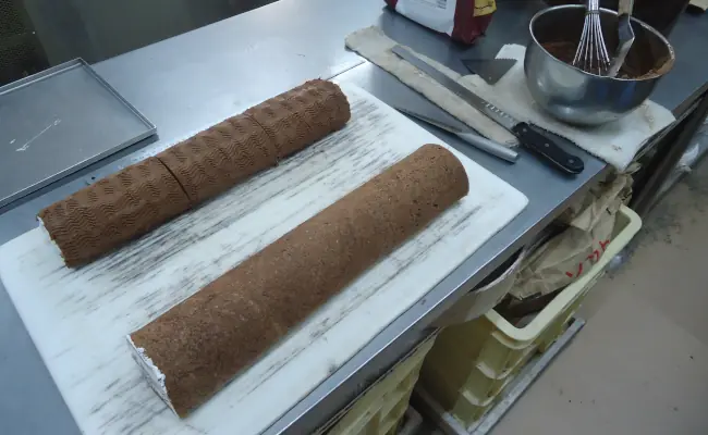 I spread chocolate icing on the Swiss roll cake, which is called Buche de Noel or something.
