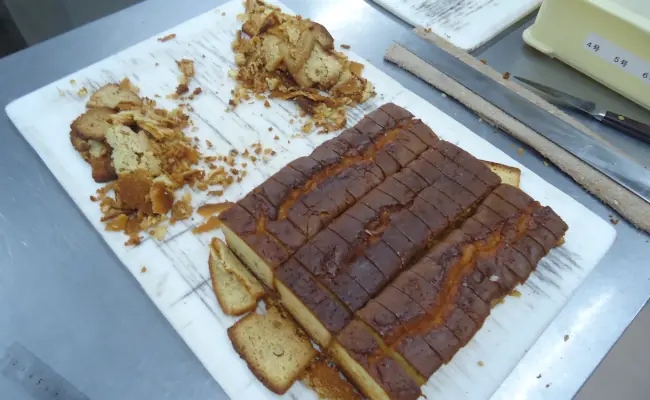 This time, I cut about 30 poundcake bars. Although it was a simple action, learning how to use a knife was enjoyable. Even with that experience, I still cannot feel the sense of cutting with the blade. The knife technique was profound.
