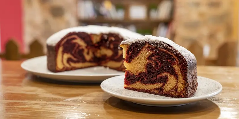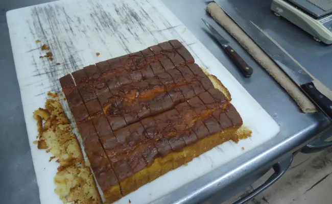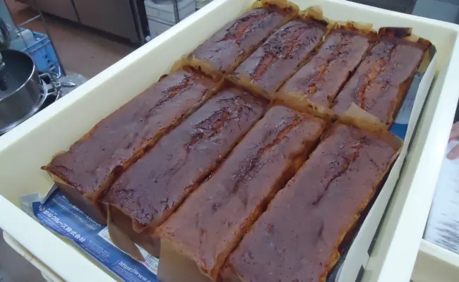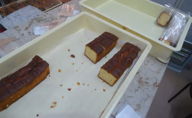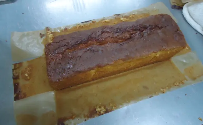 After mixing ingredients, stirring them, baking, and resting, the pound cake bar was finished, as shown in the following photo.