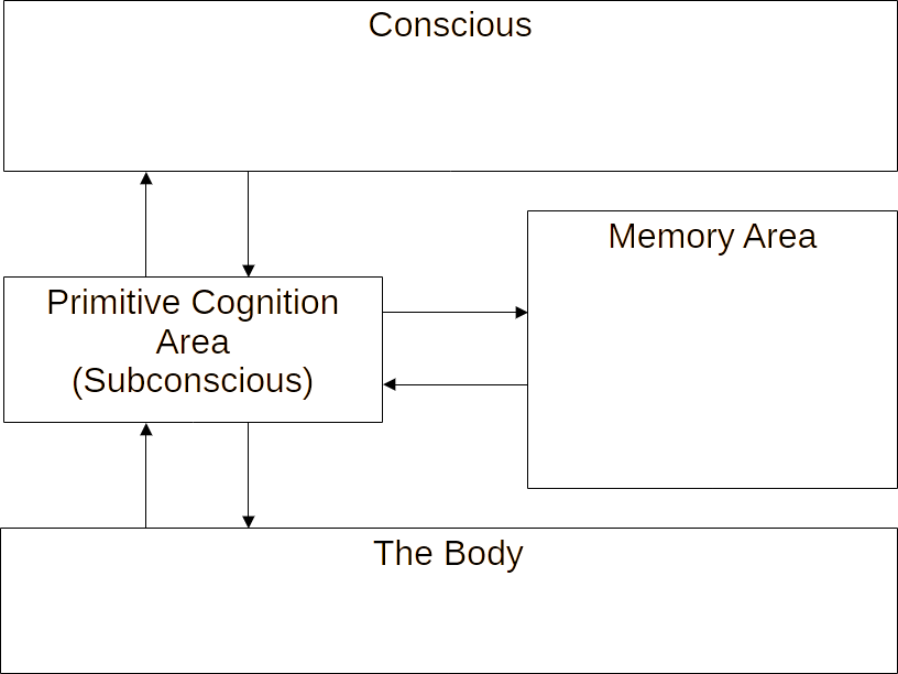- The primitive cognition area (the subconscious) is the part that connects the conscious with the other parts. In my theory, we will not delve into it.