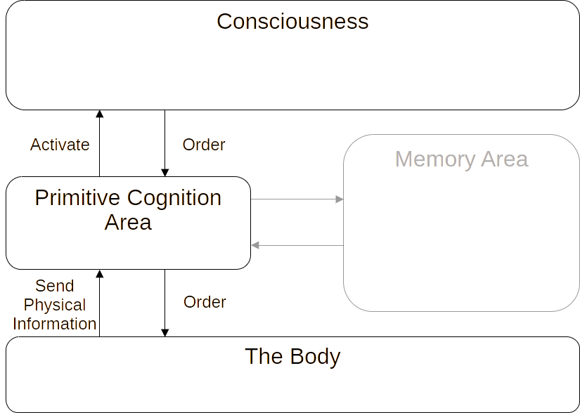 When the body has had enough rest or has another issue, the primitive cognition area detects it and activates the conscious, sending the information that ‘the body seems hungry’ and prompting the next action.